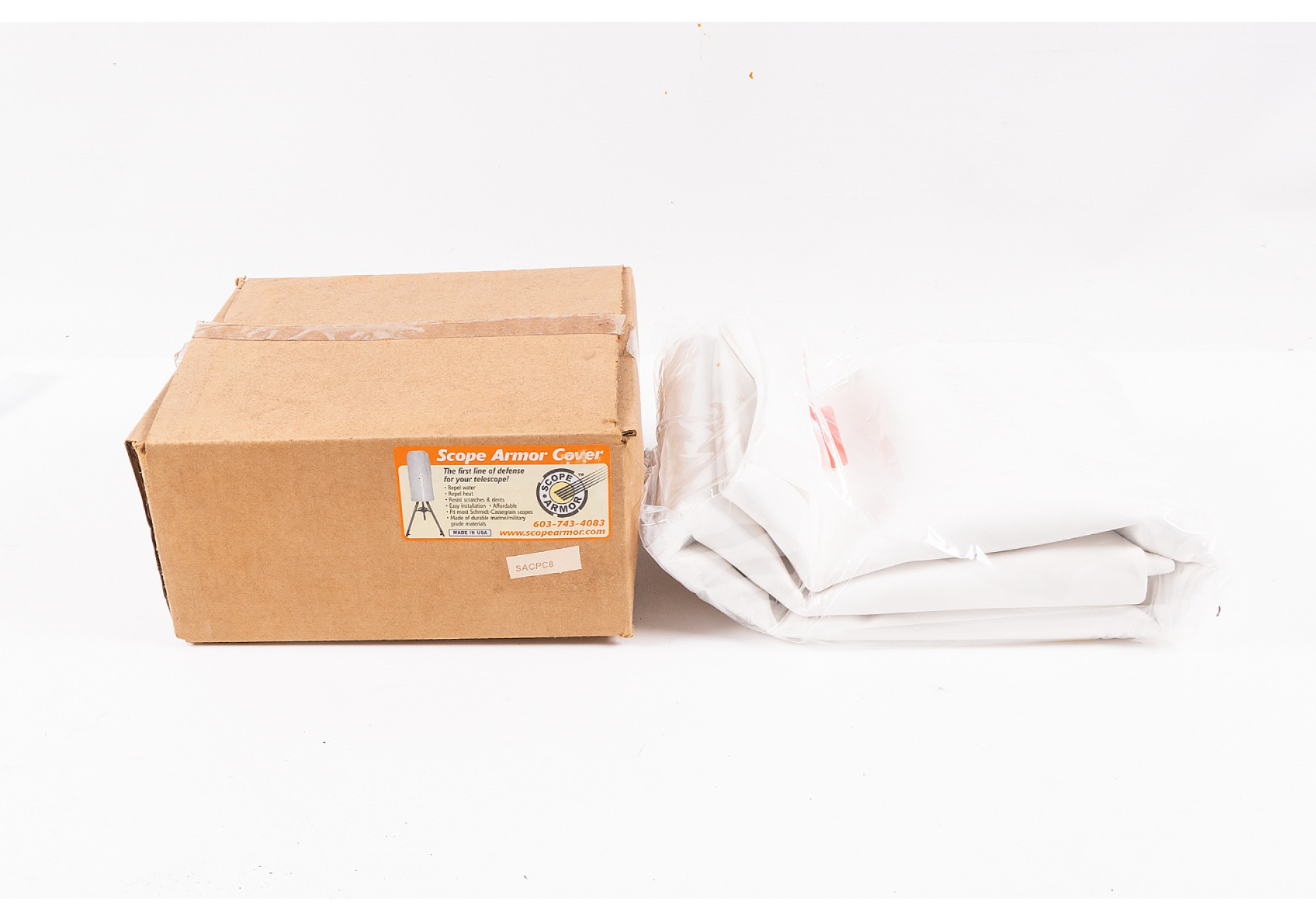 The Scope Armor Telescope Protector is a protective cover made of marine/military grade materials that are UV stable, and are waterproof and mildew-resistant. This cover is made for various fork-mounted 8" or similar-sized scopes. This product is made in the USA